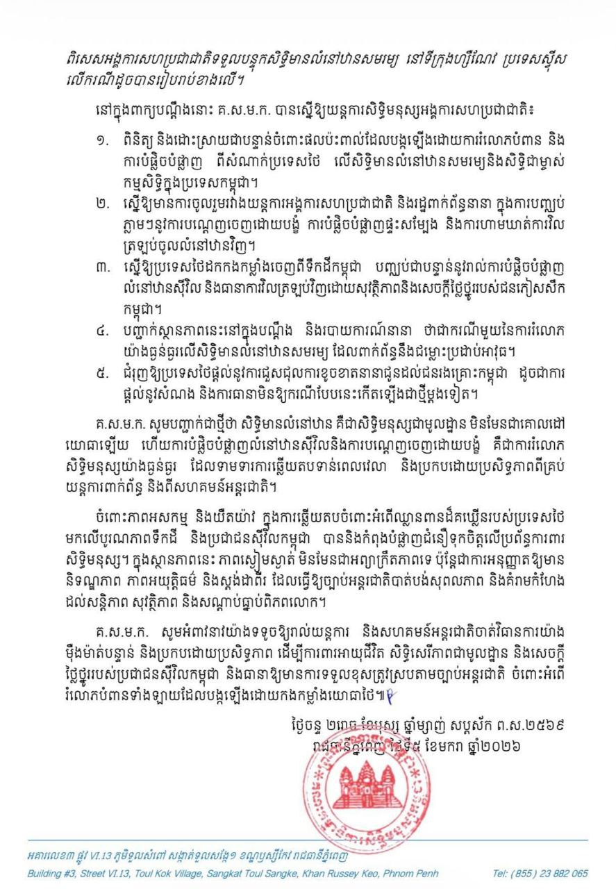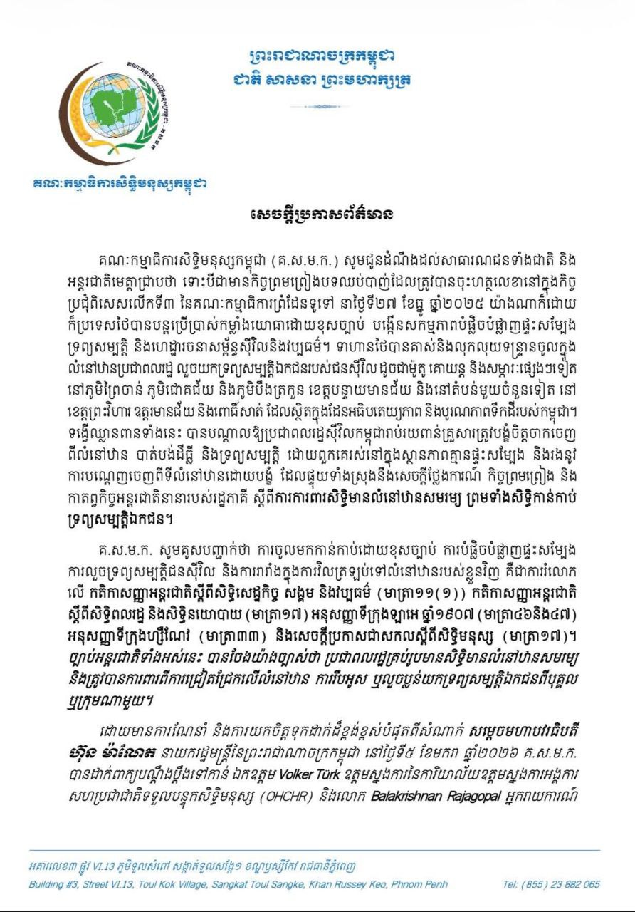 សេចក្តីប្រកាសព័ត៌មាន គណៈកម្មាធិការសិទ្ធិមនុស្សកម្ពុជា (គ.ស.ម.ក.) បានដាក់ពាក្យបណ្តឹង ទៅកាន់យន្តការសិទ្ធិមនុស្សនៃអង្គការសហប្រជាជាតិ ទាមទារឱ្យចាត់វិធានការយ៉ាងឆាប់រហ័ស និងម៉ឺងម៉ាត់ ចំពោះការរំលោភសិទ្ធិមានលំនៅឋាន និងសិទ្ធិកាន់កាប់ទ្រព្យសម្បត្តិឯកជនរបស់ប្រជាពលរដ្ឋកម្ពុជា ដែលបង្កឡើងដោយអំពើឈ្លានពាន ការបំផ្លិចបំផ្លាញផ្ទះសម្បែង ការលួចយកទ្រព្យសម្បត្តិ និងការបណ្តេញចេញដោយបង្ខំពីកងកម្លាំងយោធាថៃ។