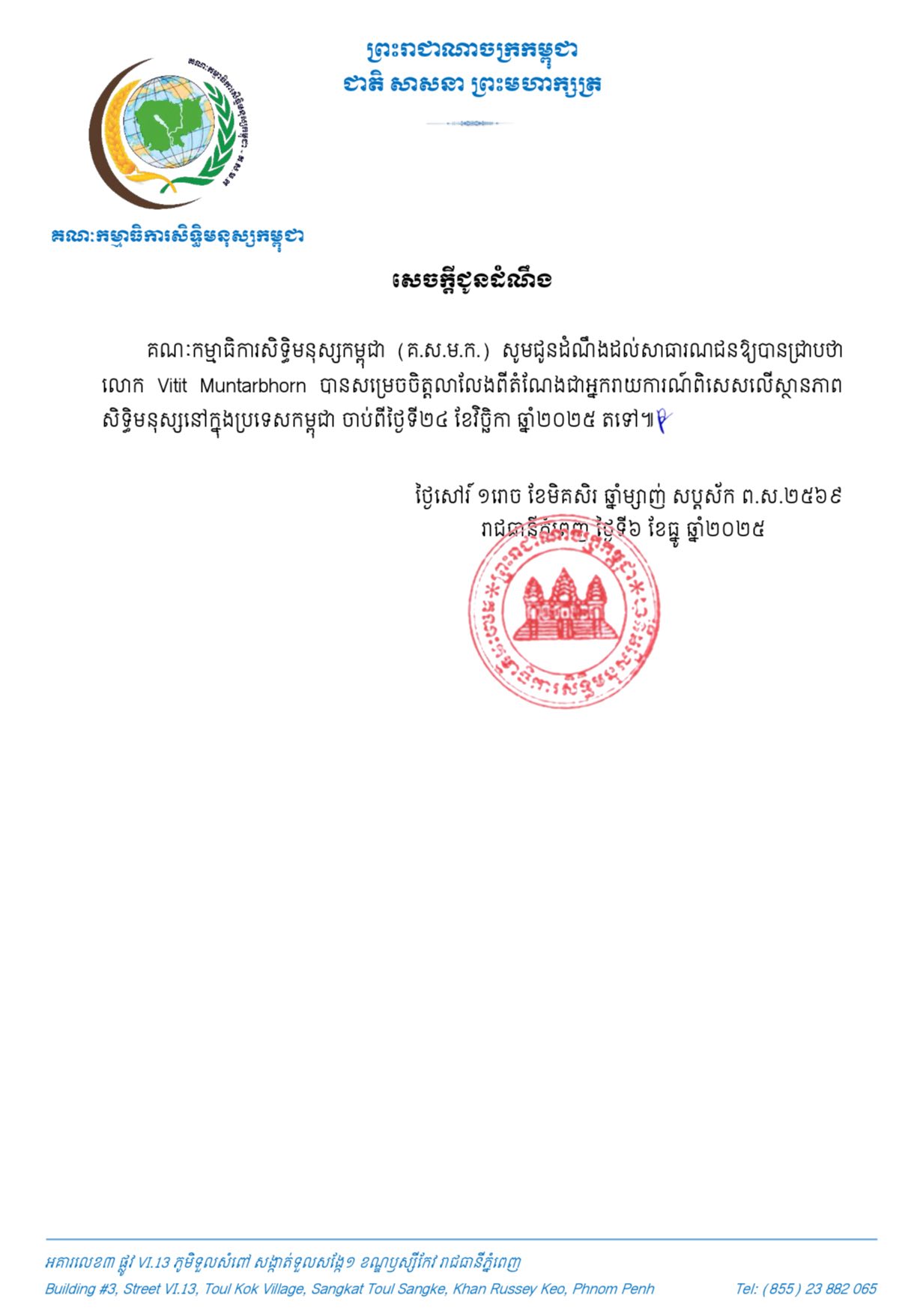 សេចក្តីជូនដំណឹងស្តីពីការលែងពីតំណែងជាអ្នករាយការណ៍ពិសេសស្តីពីស្ថានភាពសិទ្ធិមនុស្សនៅក្នុងប្រទេសកម្ពុជា។