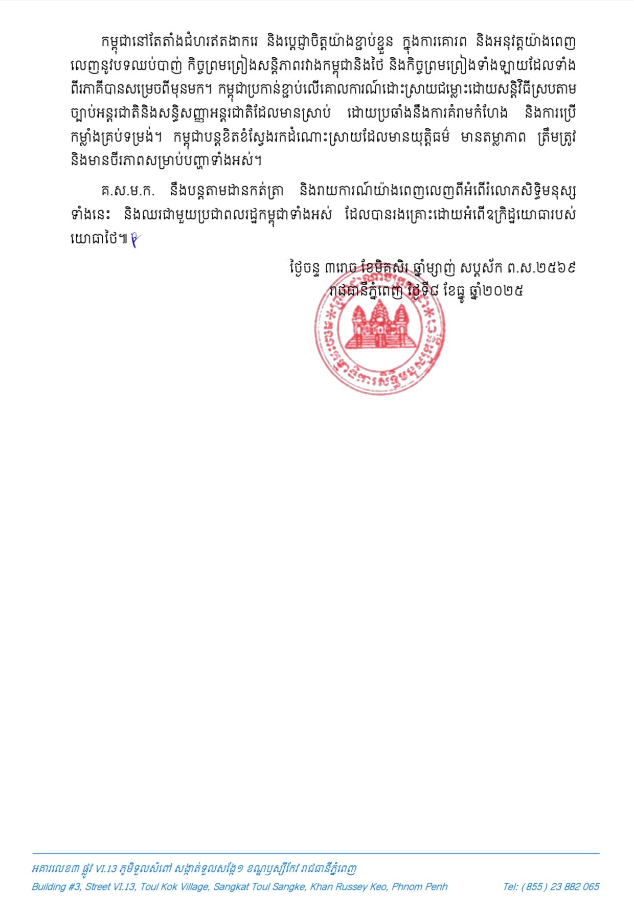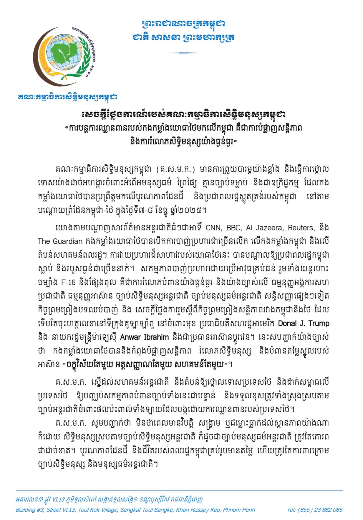 សេចក្ដីថ្លែងការណ៍របស់គណៈកម្មាធិការសិទ្ធិមនុស្សកម្ពុជា «ការបន្តការឈ្លានពានរបស់កងកម្លាំងយោធាថៃមកលើកម្ពុជា គឺជាការបំផ្លាញសន្តិភាពនិងការរំលោភសិទ្ធិមនុស្សយ៉ាងធ្ងន់ធ្ងរ»