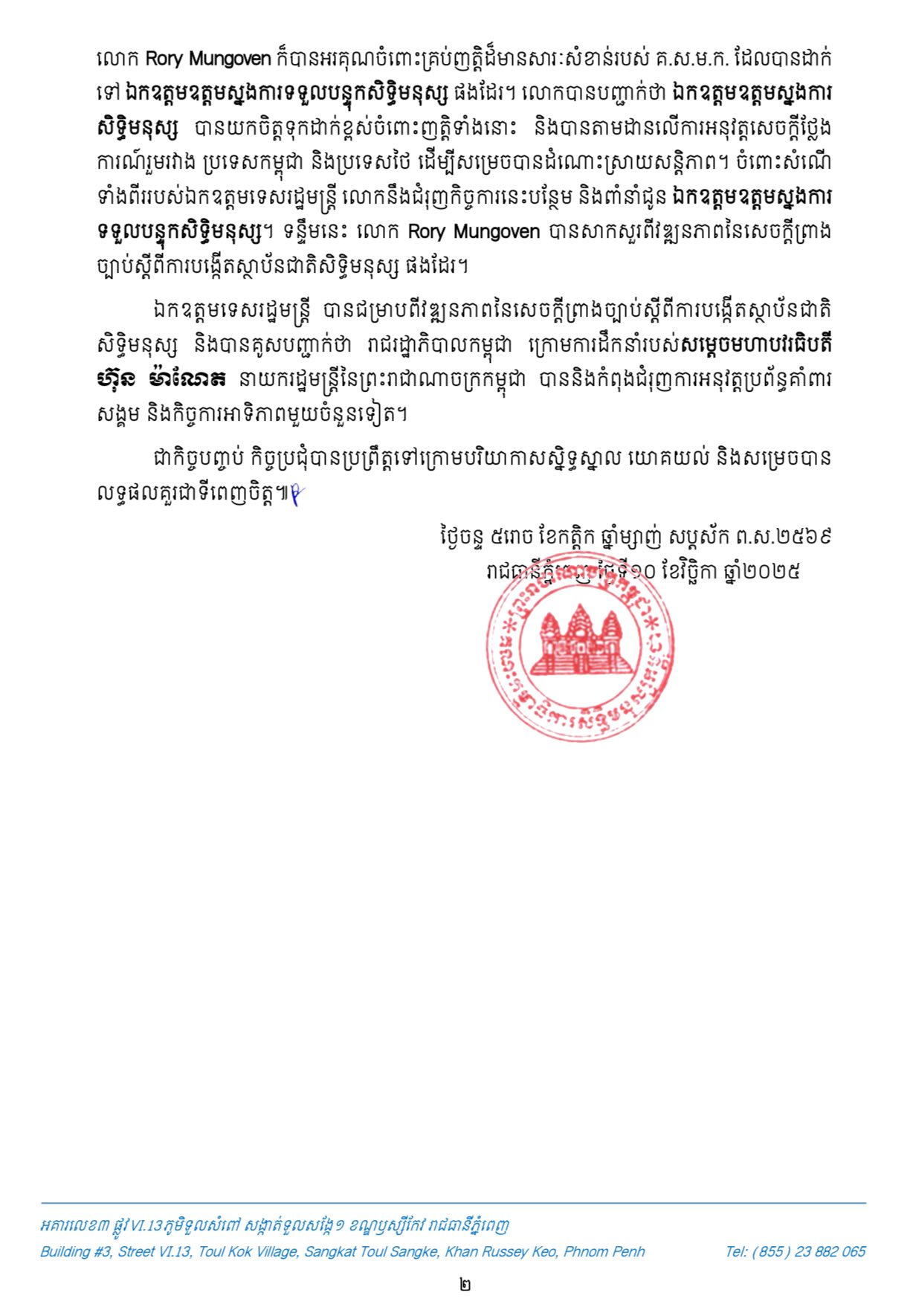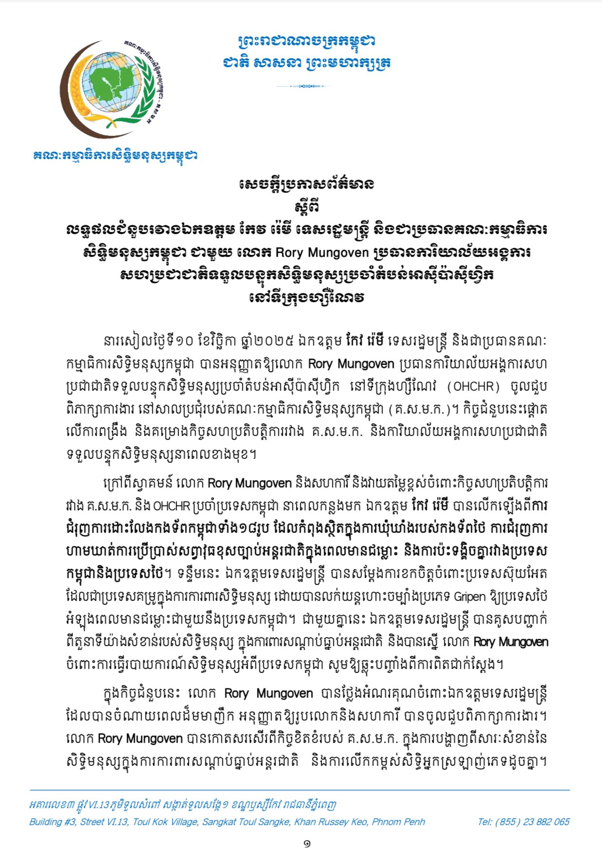 សេចក្តីប្រកាសព័ត៌មាន ស្តីពីលទ្ធផលជំនួបរវាងឯកឧត្តម កែវ រ៉េមី ទេសរដ្ឋមន្រ្តីនិងជាប្រធានគណៈកម្មាធិការសិទ្ធិមនុស្សកម្ពុជា ជាមួយ លោក Rory Mungoven ប្រធានការិយាល័យអង្គការសហប្រជាជាតិទទួលបន្ទុកសិទ្ធិមនុស្សប្រចាំតំបន់អាស៊ីប៉ាស៊ីហ្វិក​ នៅទីក្រុងហ្សឺណែវ។