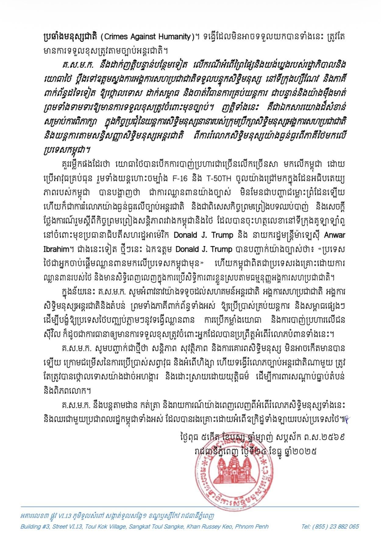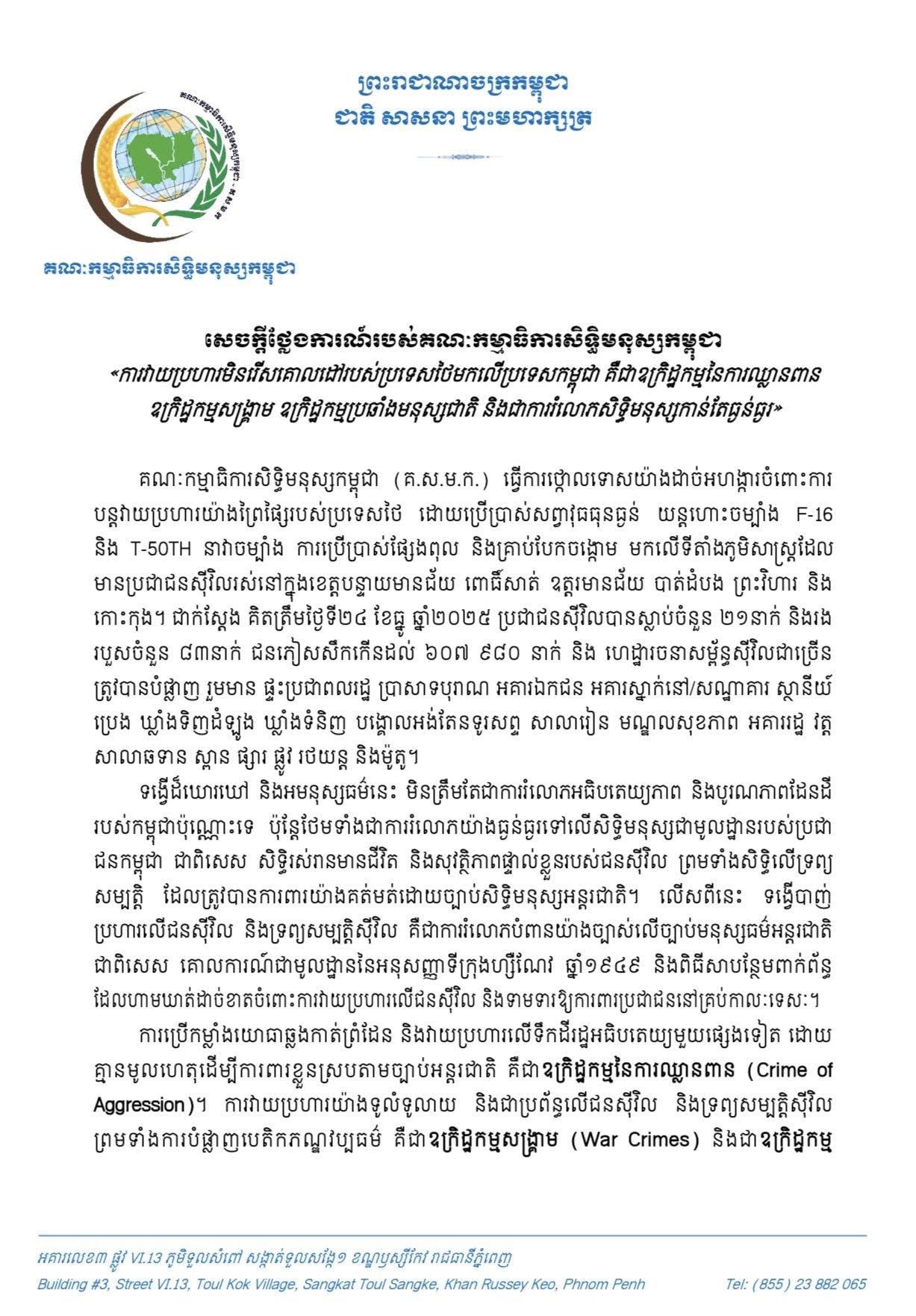 សេចក្ដីថ្លែងការណ៍របស់គណៈកម្មាធិការសិទ្ធិមនុស្សកម្ពុជា «ការវាយប្រហារមិនរើសគោលដៅរបស់ប្រទេសថៃមកលើប្រទេសកម្ពុជា គឺជាឧក្រិដ្ឋកម្មនៃការឈ្លានពាន ឧក្រិដ្ឋកម្មសង្គ្រាម ឧក្រិដ្ឋកម្មប្រឆាំងមនុស្សជាតិ និងជាការរំលោភសិទ្ធិមនុស្សកាន់តែធ្ងន់ធ្ងរ»