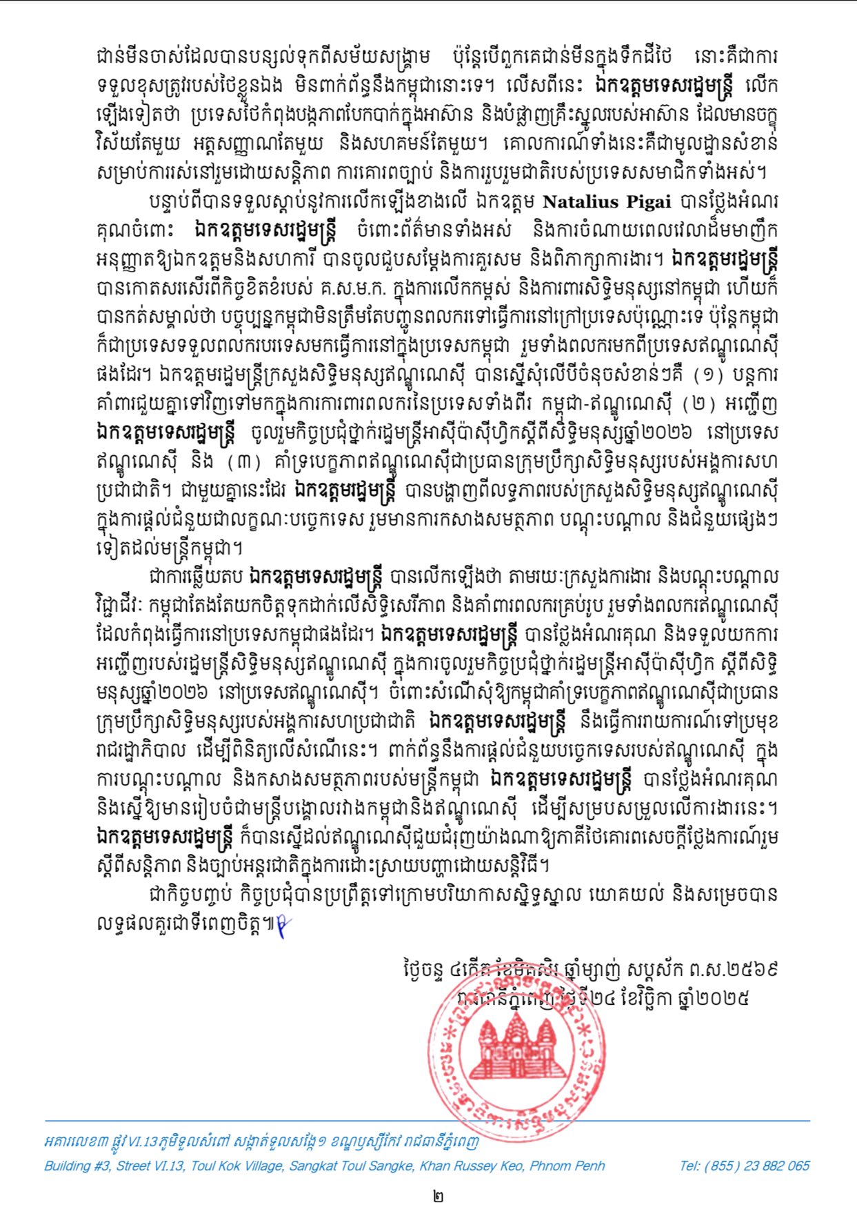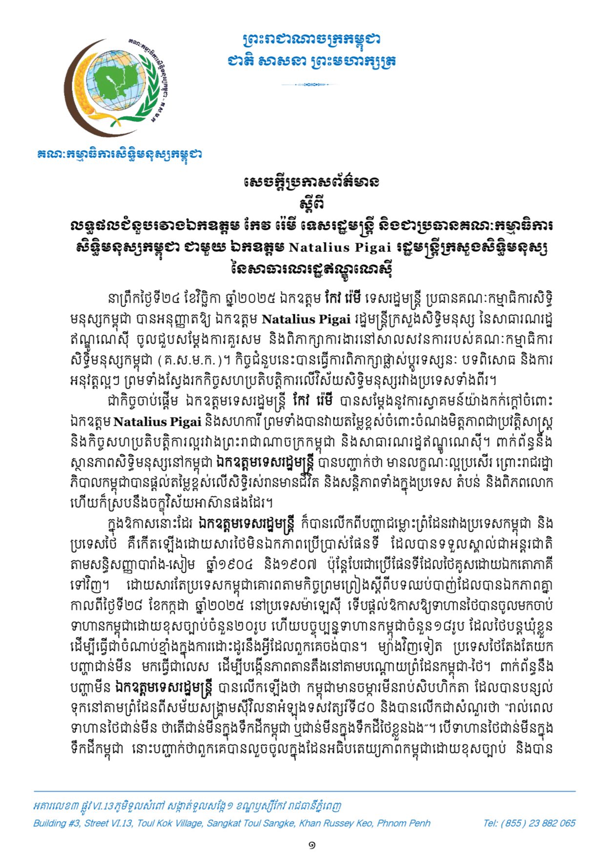 សេចក្តីប្រកាសព័ត៌មាន ស្តីពីលទ្ធផលជំនួបរវាងឯកឧត្តម កែវ រ៉េមី ទេសរដ្ឋមន្រ្តី ប្រធានគណៈកម្មាធិការសិទ្ធិមនុស្សកម្ពុជា ជាមួយ ឯកឧត្តម Natalius Pigai រដ្ឋមន្រ្តីក្រសួងសិទ្ធិមនុស្ស នៃសាធារណរដ្ឋឥណ្ឌូណេស៊ី។