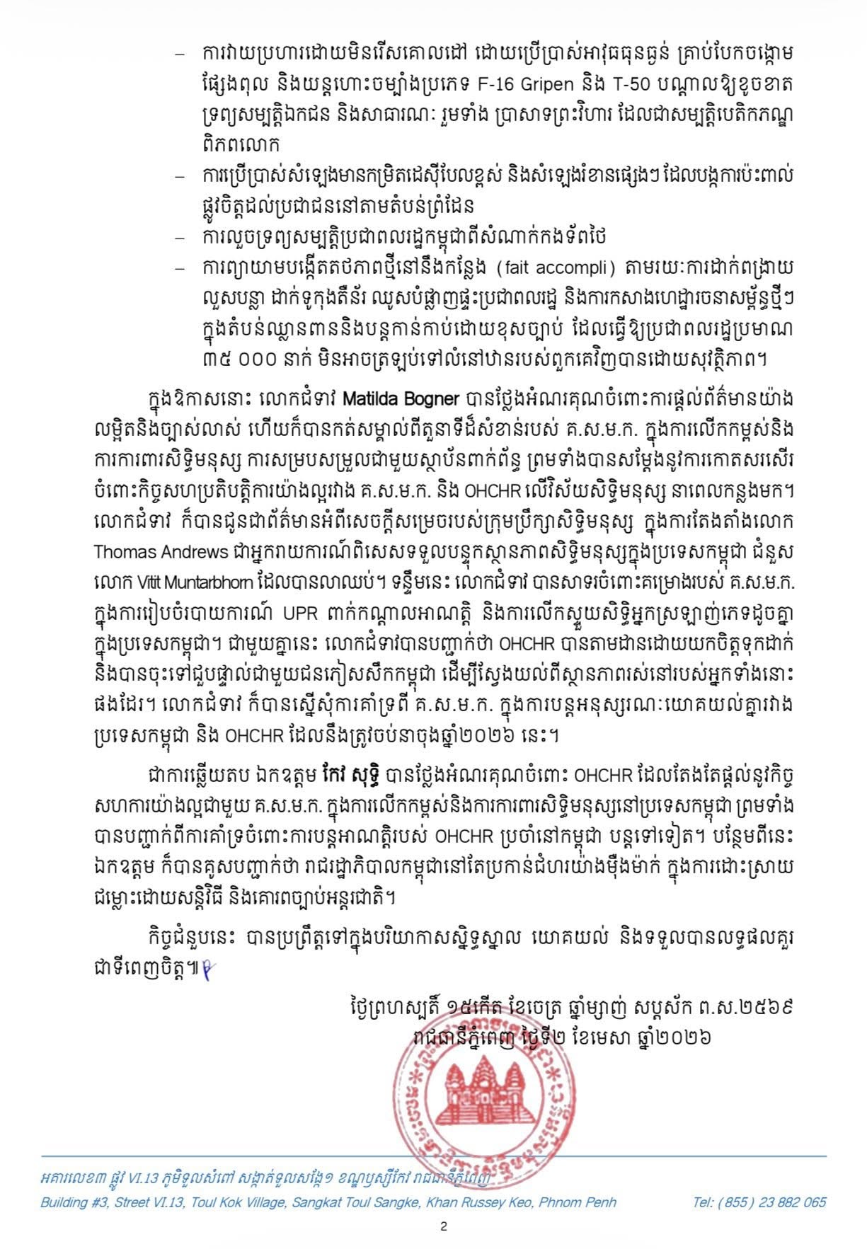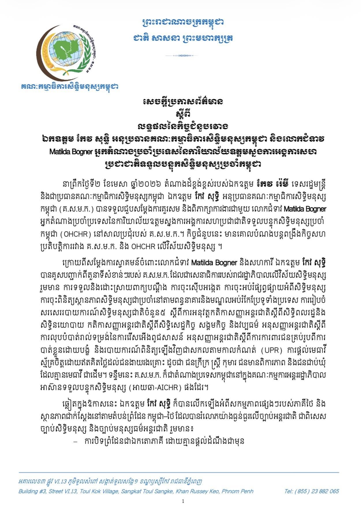 សេចក្ដីប្រកាសព័ត៌មានស្ដីពី លទ្ធផលនៃកិច្ចជំនួបរវាង ឯកឧត្តម កែវ សុទ្ធិ អនុប្រធាគណៈកម្មាធិការសិទ្ធិមនុស្សកម្ពុជា និងលោកជំទាវ Matilda Bogner អ្នកតំណាងប្រចាំប្រទេសនៃការិយាល័យឧត្តមស្នងការអង្គការសហប្រជាជាតិទទួលបន្ទុកសិទ្ធិមនុស្សប្រចាំកម្ពុជា។