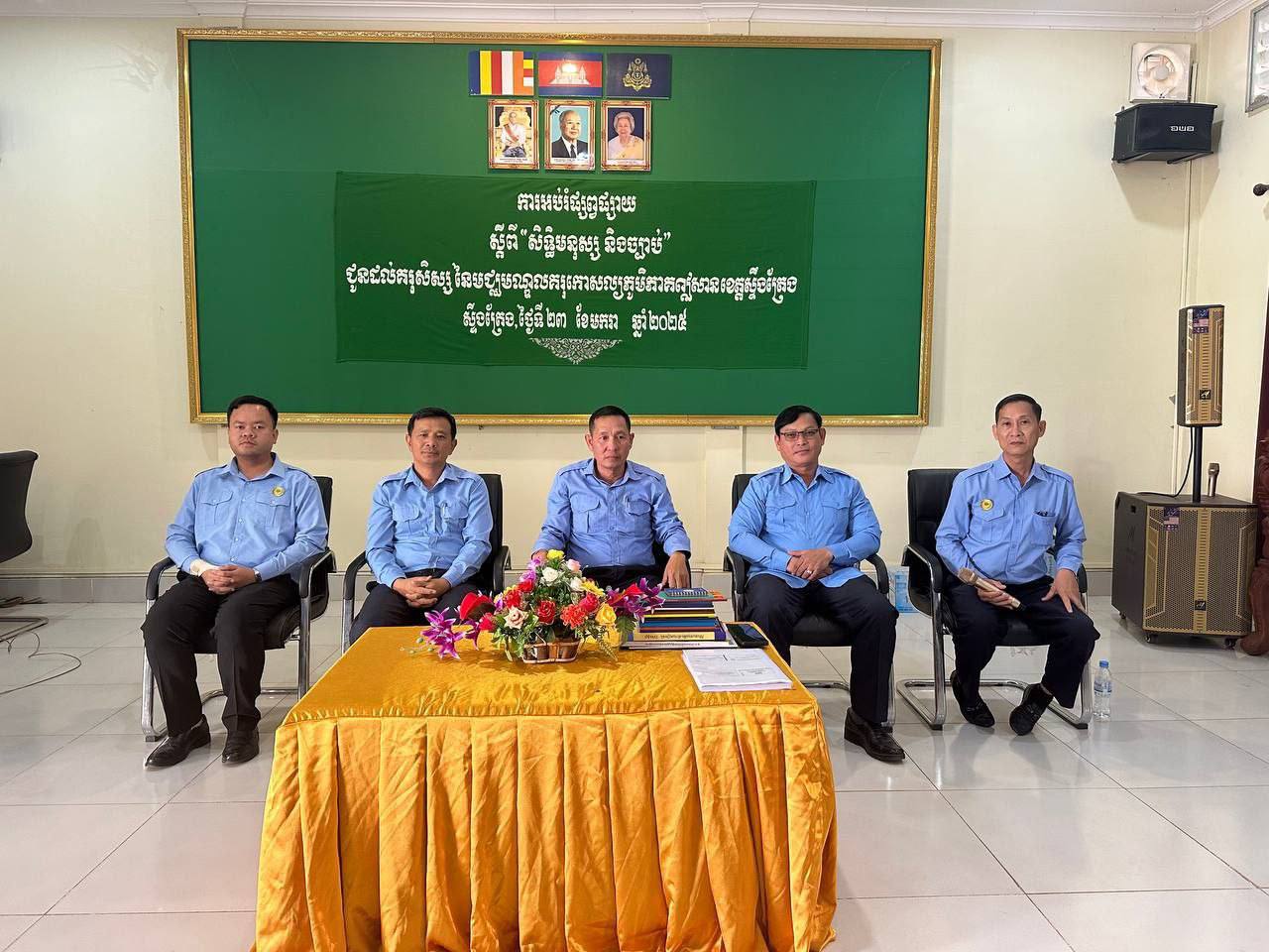 ខេត្តស្ទឹងត្រែង ៖ដោយមានការយកចិត្តទុកដាក់របស់ឯកឧត្តមទេសរដ្ឋមន្ត្រី កែវ រ៉េមី ប្រធានគណៈកម្មាធិការសិទ្ធិមនុស្សកម្ពុជា បានចាត់តាំងឯកឧត្តម ឃាំង ឆាយ សមាជិក.គ.ស.ម.ក ដឹកនាំក្រុមការងារ ចុះអប់រំផ្សព្វផ្សាយស្តីពី «សិទ្ធិមនុស្ស និងច្បាប់ » ដល់គរុសិស្ស ចំនួន១០០នាក់ នៅសាលប្រជុំនៃមជ្ឈមណ្ឌលគរុកោសល្យភូមិភាគឦសាន ខេត្តស្ទឹងត្រែង នៅរសៀលថ្ងៃព្រហស្បតិ៍ ១០រោច ខែបុស្ស ឆ្នាំរោង ឆស័ក ព.ស ២៥៦៨ ដែលត្រូវនឹងថ្ងៃទី២៣ ខែមករា ឆ្នាំ២០២៥។