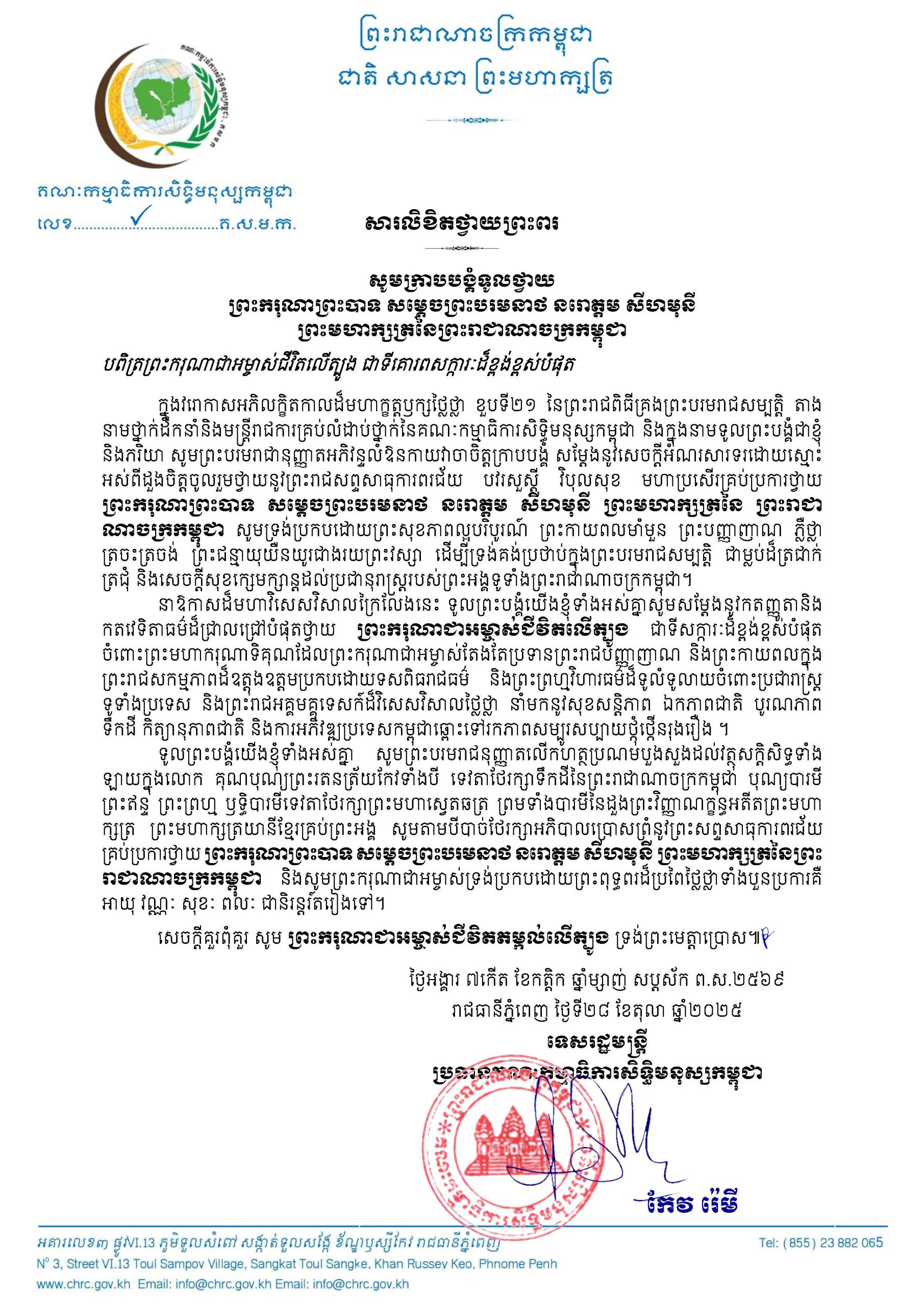 សារលិខិតថ្វាយព្រះពរ សូមក្រាបបង្គំទូលថ្វាយ ព្រះករុណាព្រះបាទ សម្តេចព្រះបរមនាថ នរោត្តម សីហមុនី ព្រះមហាក្សត្រនៃព្រះរាជាណាចក្រកម្ពុជា