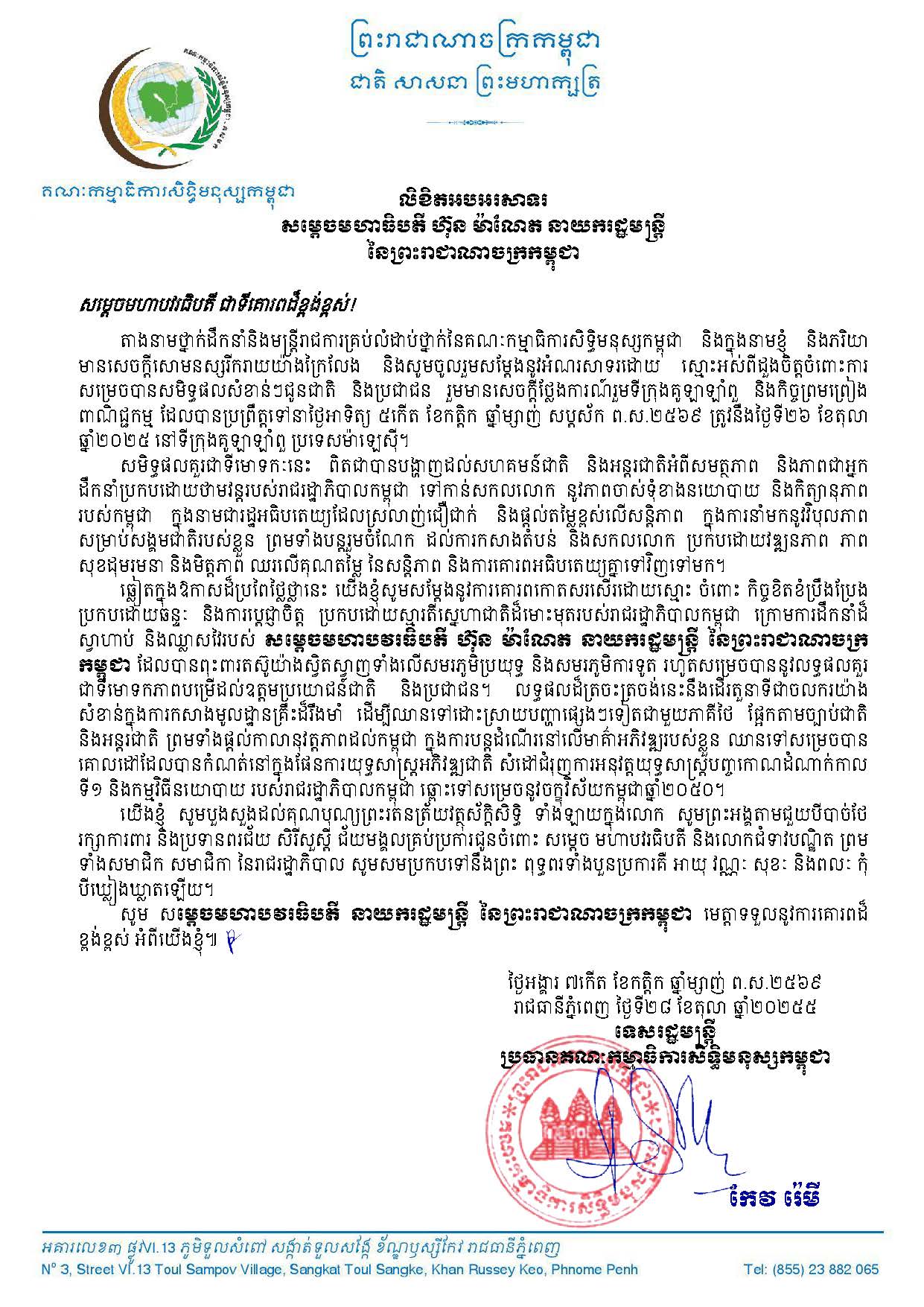 លិខិតអបអរសាទរ សម្តេចមហាធិបតី ហ៊ុន ម៉ាណែត នាយករដ្ឋមន្ត្រី នៃព្រះរាជាណាចក្រកម្ពុជា