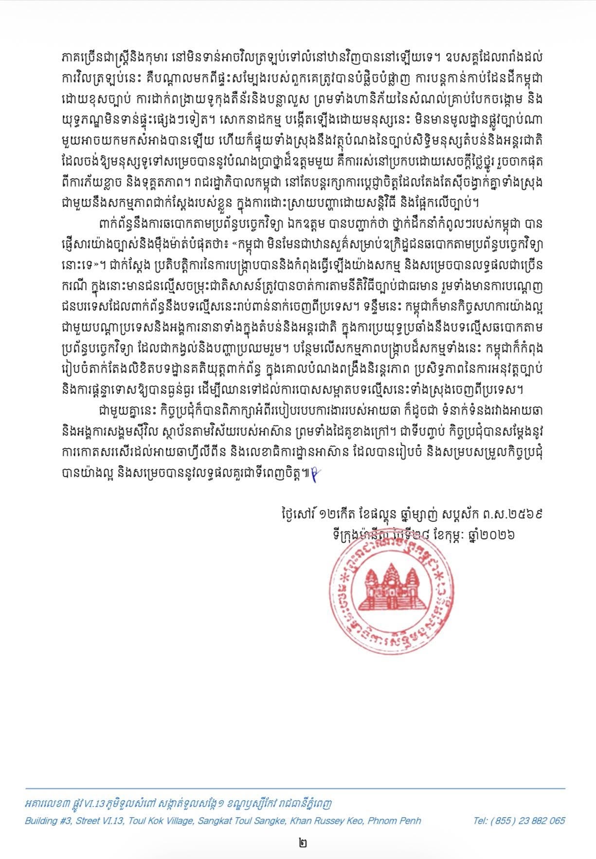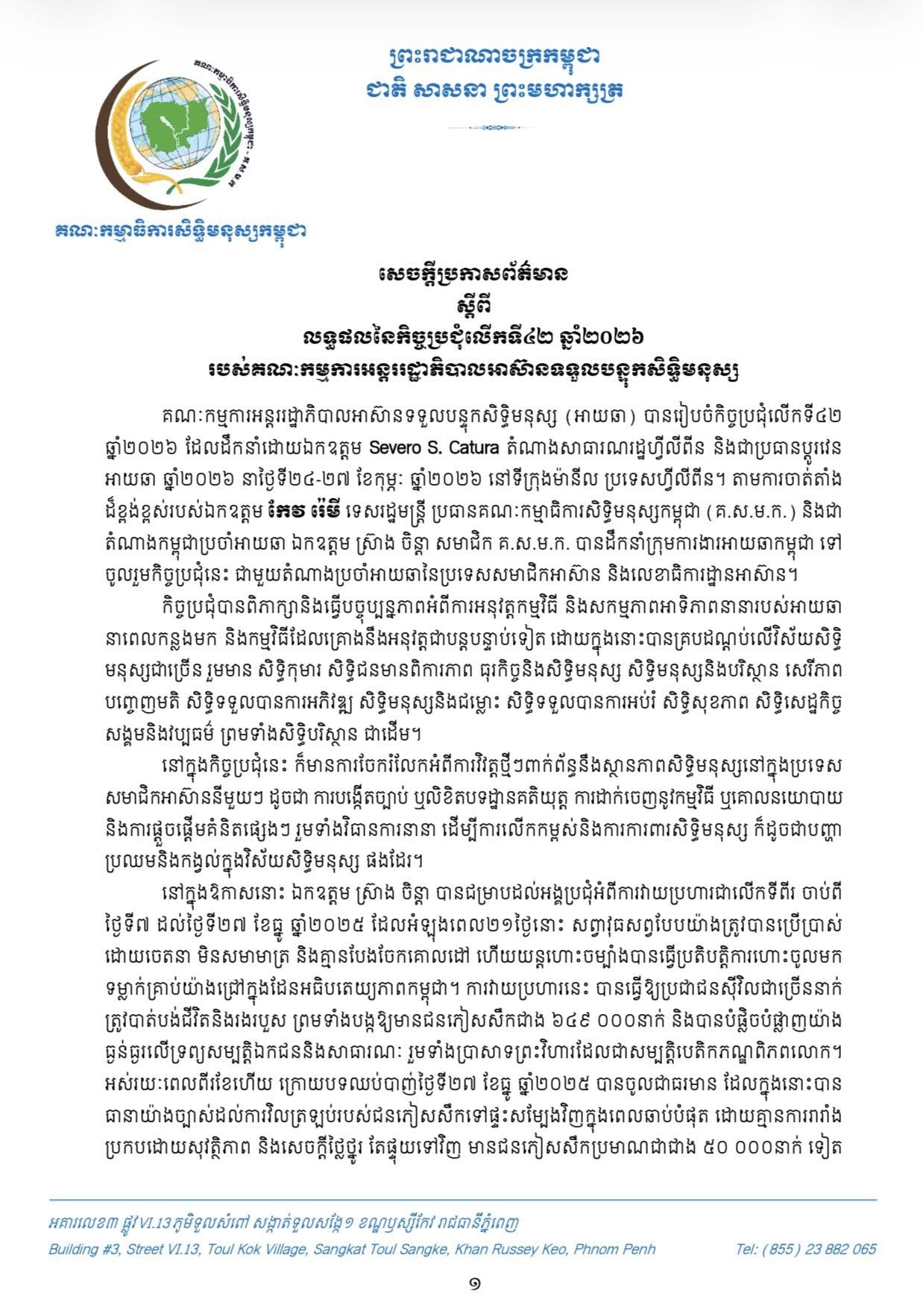 សេចក្តីប្រកាសព័ត៌មានស្តីពីលទ្ធផលនៃកិច្ចប្រជុំលើកទី៤២ ឆ្នាំ២០២៦ របស់គណៈកម្មការអន្តររដ្ឋាភិបាលអាស៊ានទទួលបន្ទុកសិទ្ធិមនុស្ស