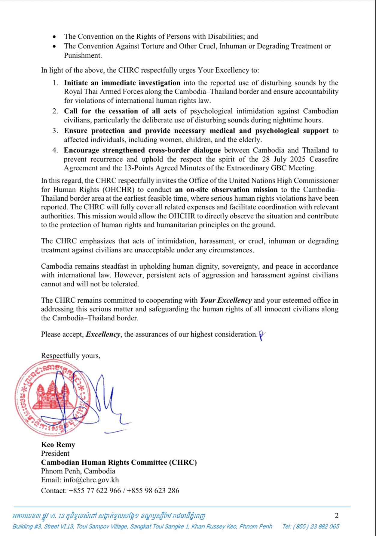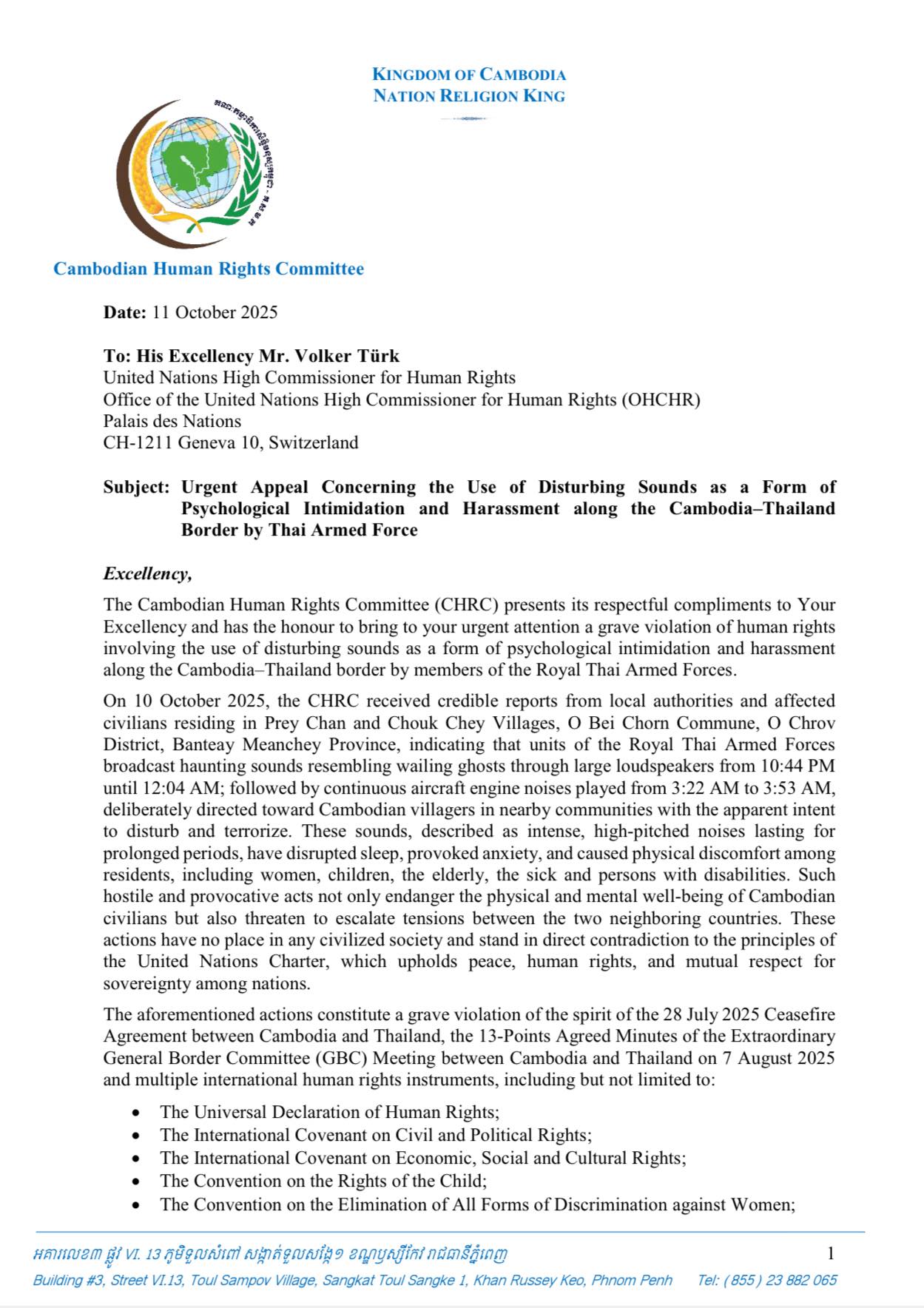 CHRC Urgently Appeals to OHCHR Over Thai Military’s Use of Disturbing Sounds to Intimidate Cambodian Civilians