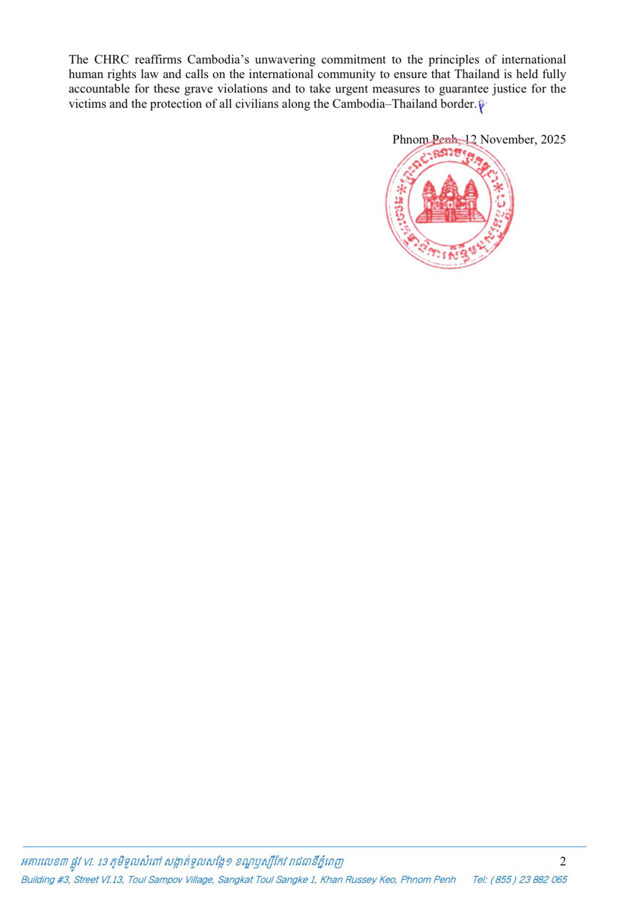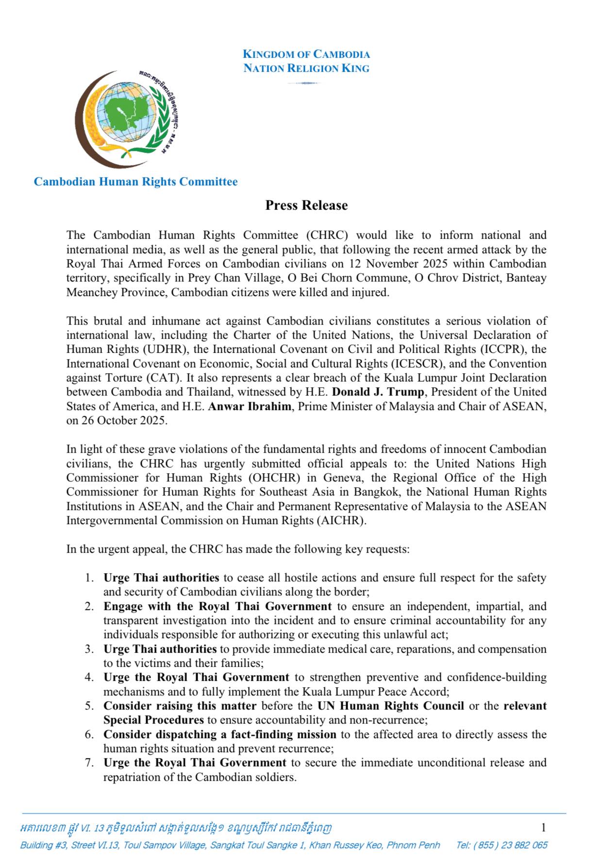 In view of the violation of the fundamental freedoms of innocent Cambodians, the Cambodian Human Rights Committee (CHRC) has prepared and submitted an urgent appeal to the United Nations High Commissioner for Human Rights (OHCHR) in Geneva, the United Nations High Commissioner for Human Rights in Southeast Asia in Bangkok, Independent National Human Rights Institutions in the ASEAN region, as well as the rotating chair and representative of Malaysia-AICHR.