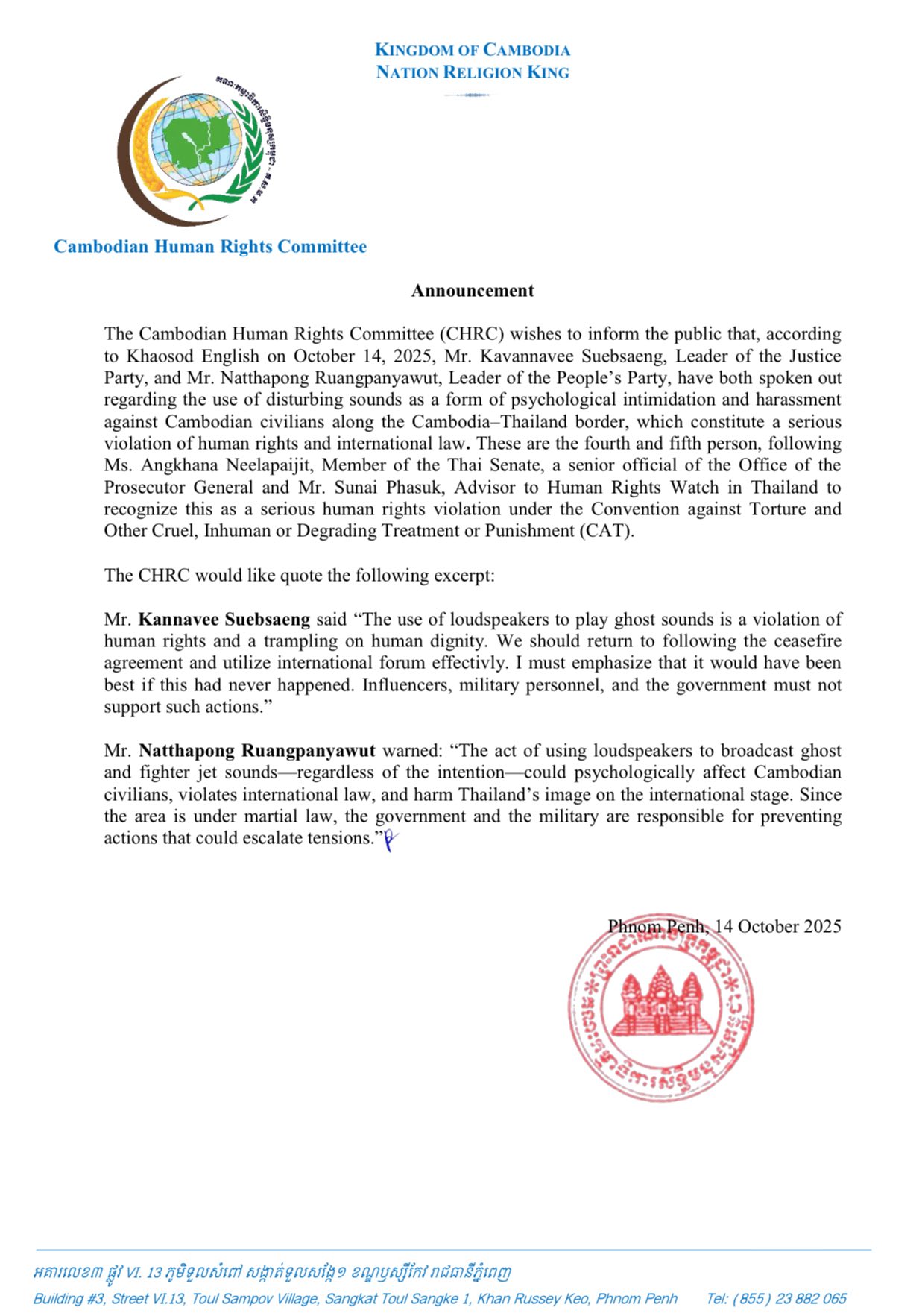 Even the Presidents of the People’s Party and the Social Justice Party of Thailand have come out to acknowledge the use of noise as a form of intimidation and psychological harassment of Cambodian people along the Cambodian-Thai border, which is a serious human rights violation, contrary to international human rights law as well as Thai law, which has brought Thailand international embarrassment. This is the fourth and fifth person, after HE Angkhana Neelapaijit and the senior official of the Office of the Attorney General of Thailand, and Mr Sunai Phasuk, an advisor to Human Rights Watch in Thailand.