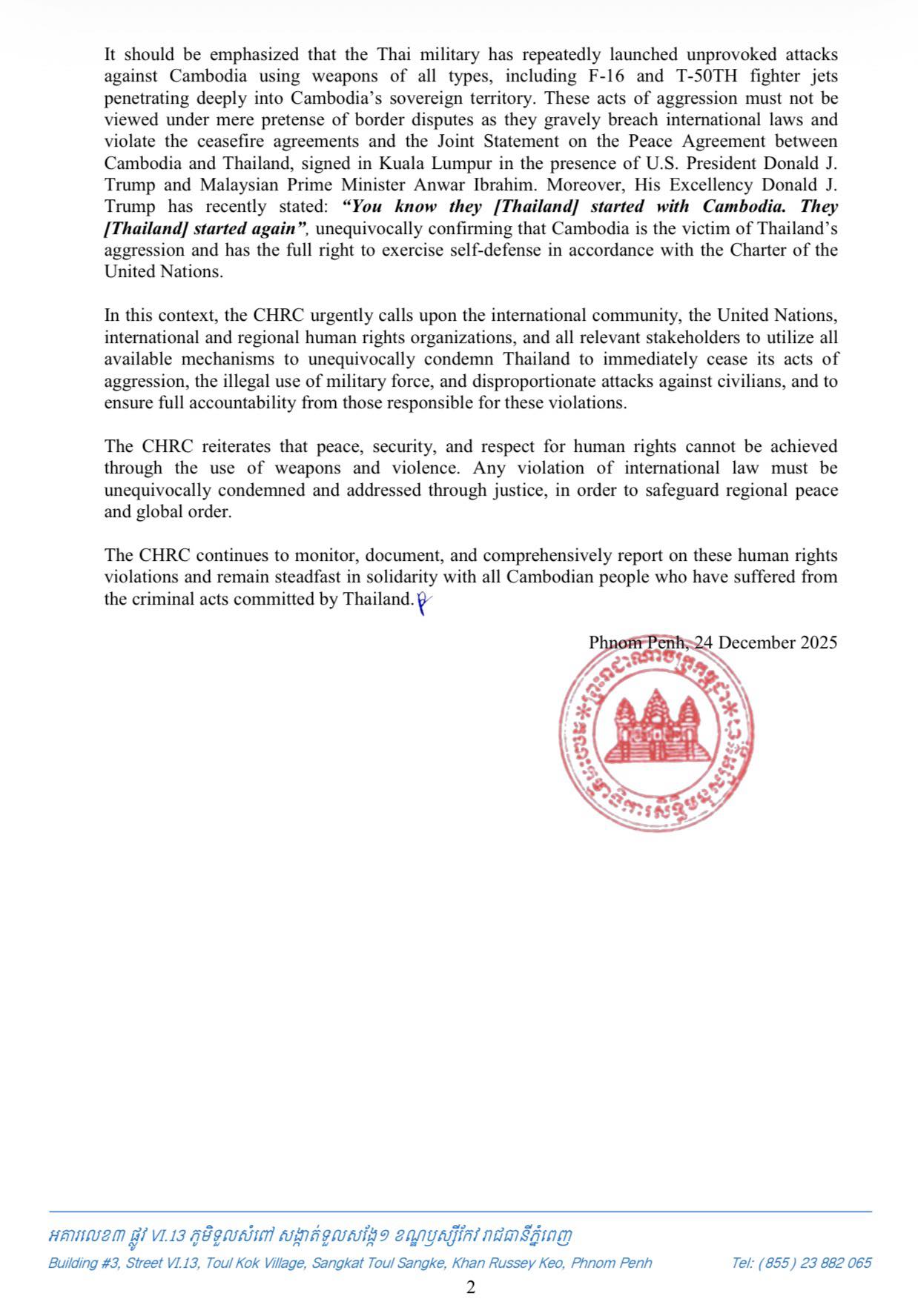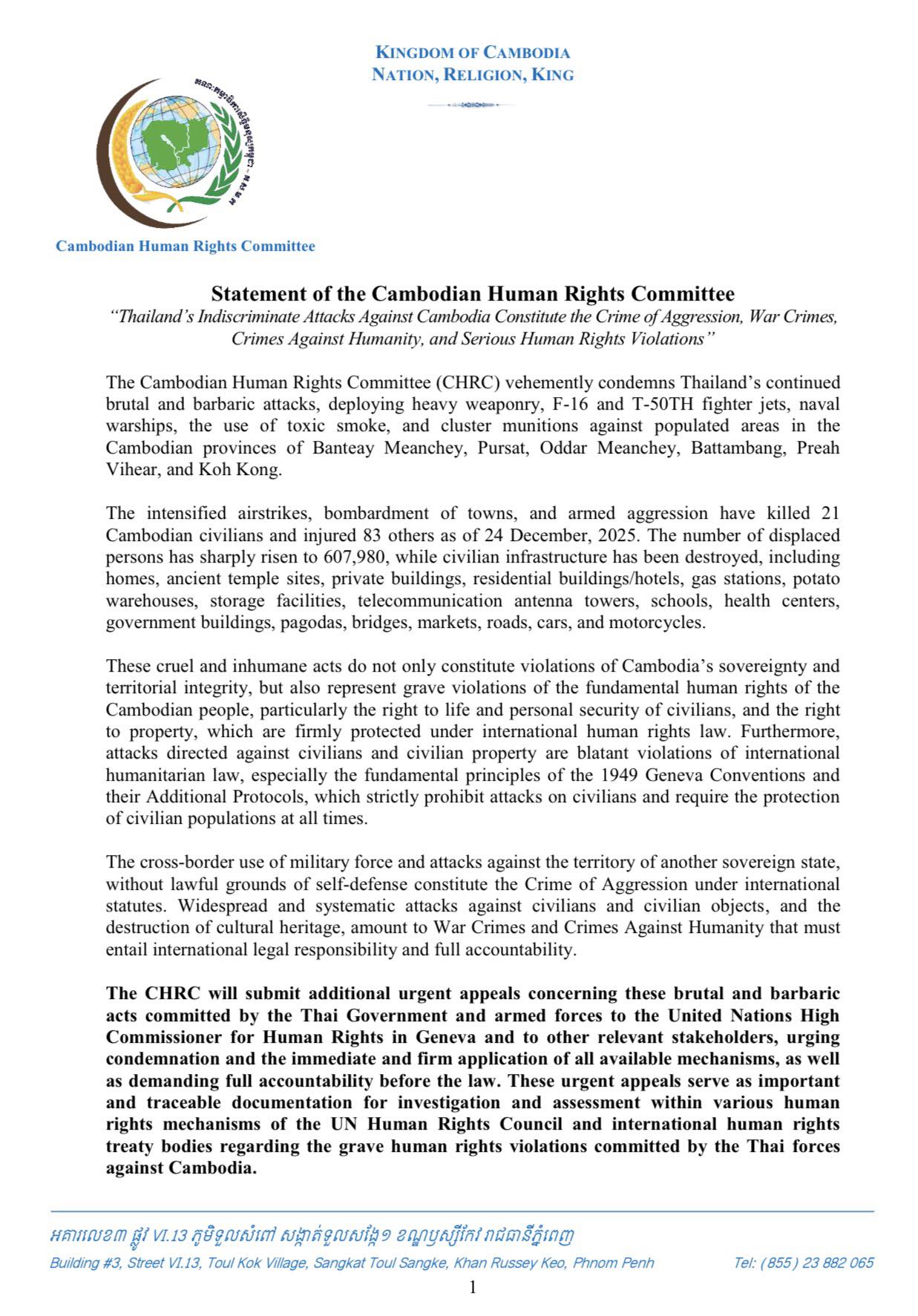 Statement of the Cambodian Human Rights Committee “Thailand’s Indiscriminate Attacks Against Cambodia Constitute the Crime of Aggression, War Crimes, Crimes Against Humanity, and Serious Human Rights Violations”