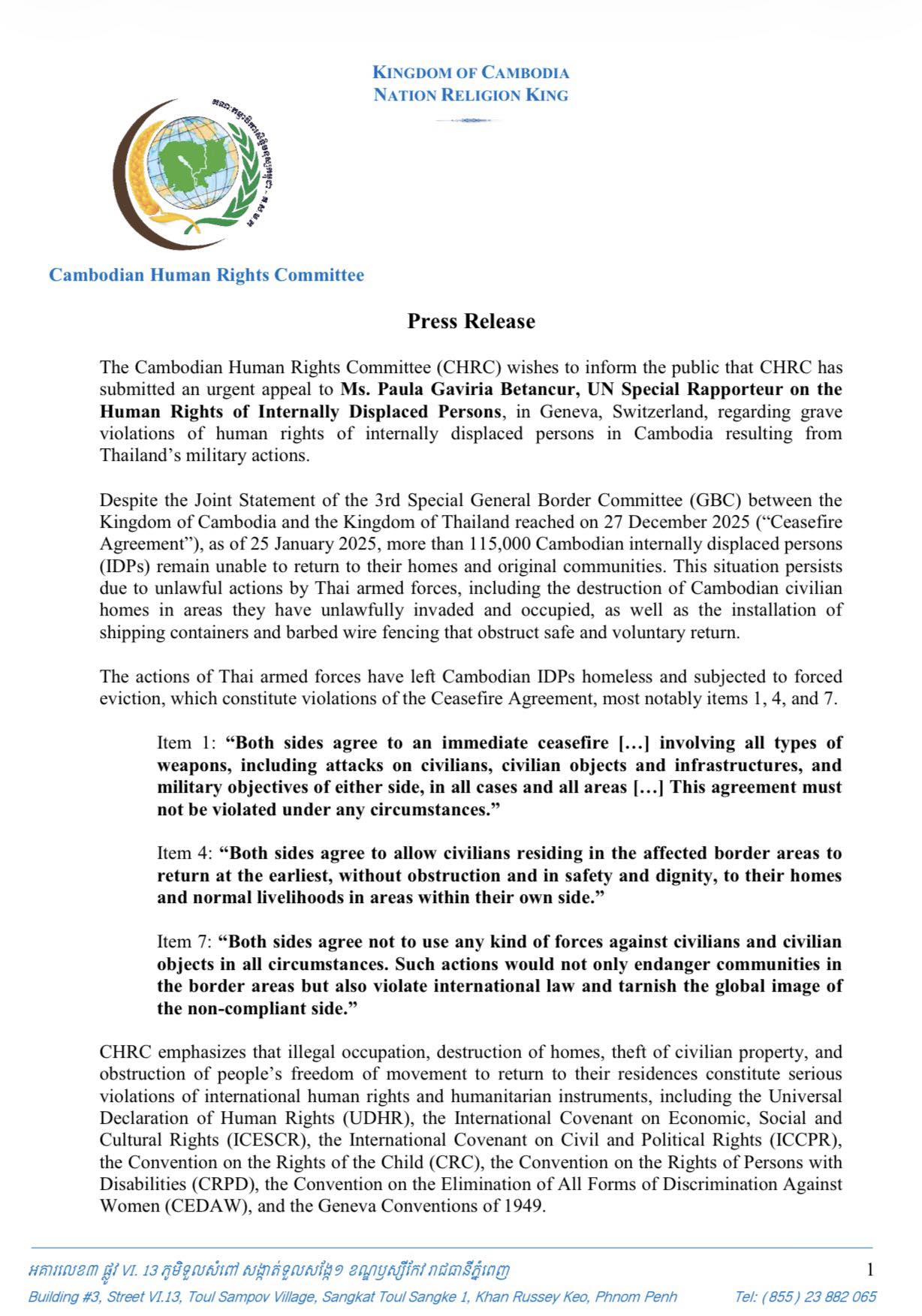 The Cambodian Human Rights Committee (CHRC) wishes to inform the public that CHRC has submitted an urgent appeal to Ms. Paula Gaviria Betancur, UN Special Rapporteur on the Human Rights of Internally Displaced Persons, in Geneva, Switzerland, regarding grave violations of human rights of internally displaced persons in Cambodia resulting from Thailand’s military actions.