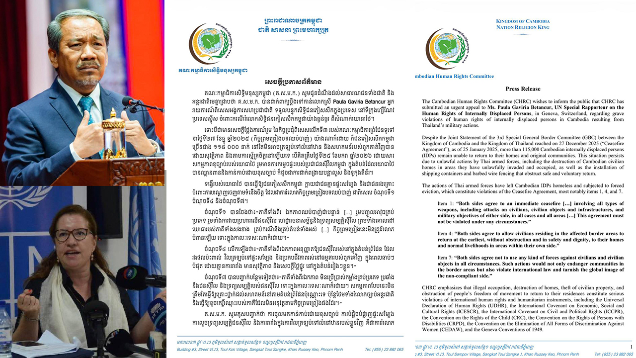 The Cambodian Human Rights Committee (CHRC) wishes to inform the public that CHRC has submitted an urgent appeal to Ms. Paula Gaviria Betancur, UN Special Rapporteur on the Human Rights of Internally Displaced Persons, in Geneva, Switzerland, regarding grave violations of human rights of internally displaced persons in Cambodia resulting from Thailand’s military actions.