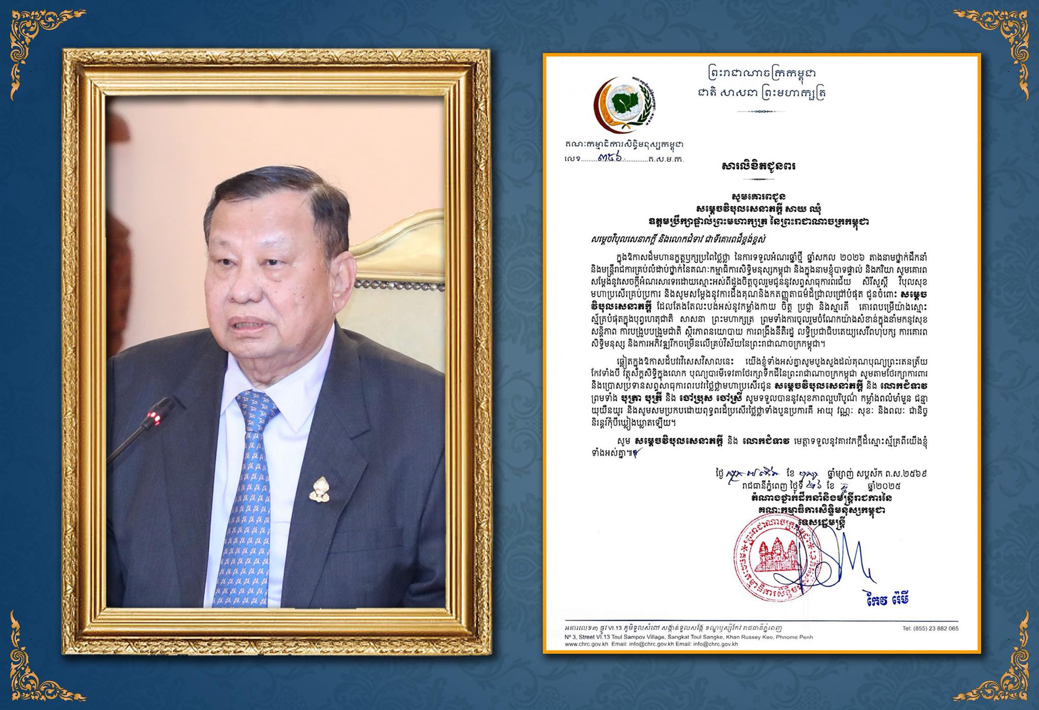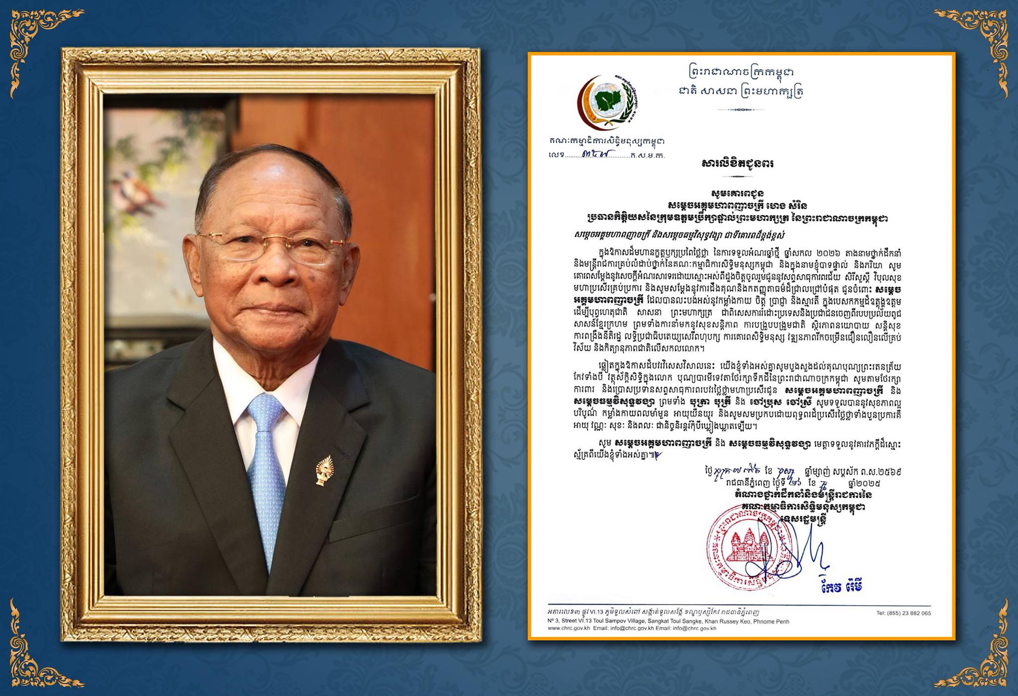 សារលិខិតជូនពរ សូមគោរពជូន សម្តេចក្រឡាហោម ស ខេង ឧត្តមប្រឹក្សាផ្ទាល់ព្រះមហាក្សត្រ នៃព្រះរាជាណាចក្រកម្ពុជា ក្នុងឱកាសដ៏មហានក្ខត្តឫក្សវិសេសវិសាលប្រពៃថ្លៃថ្លា នៃការទទួលអំណរឆ្នាំថ្មី ឆ្នាំសកល ២០២៦។
