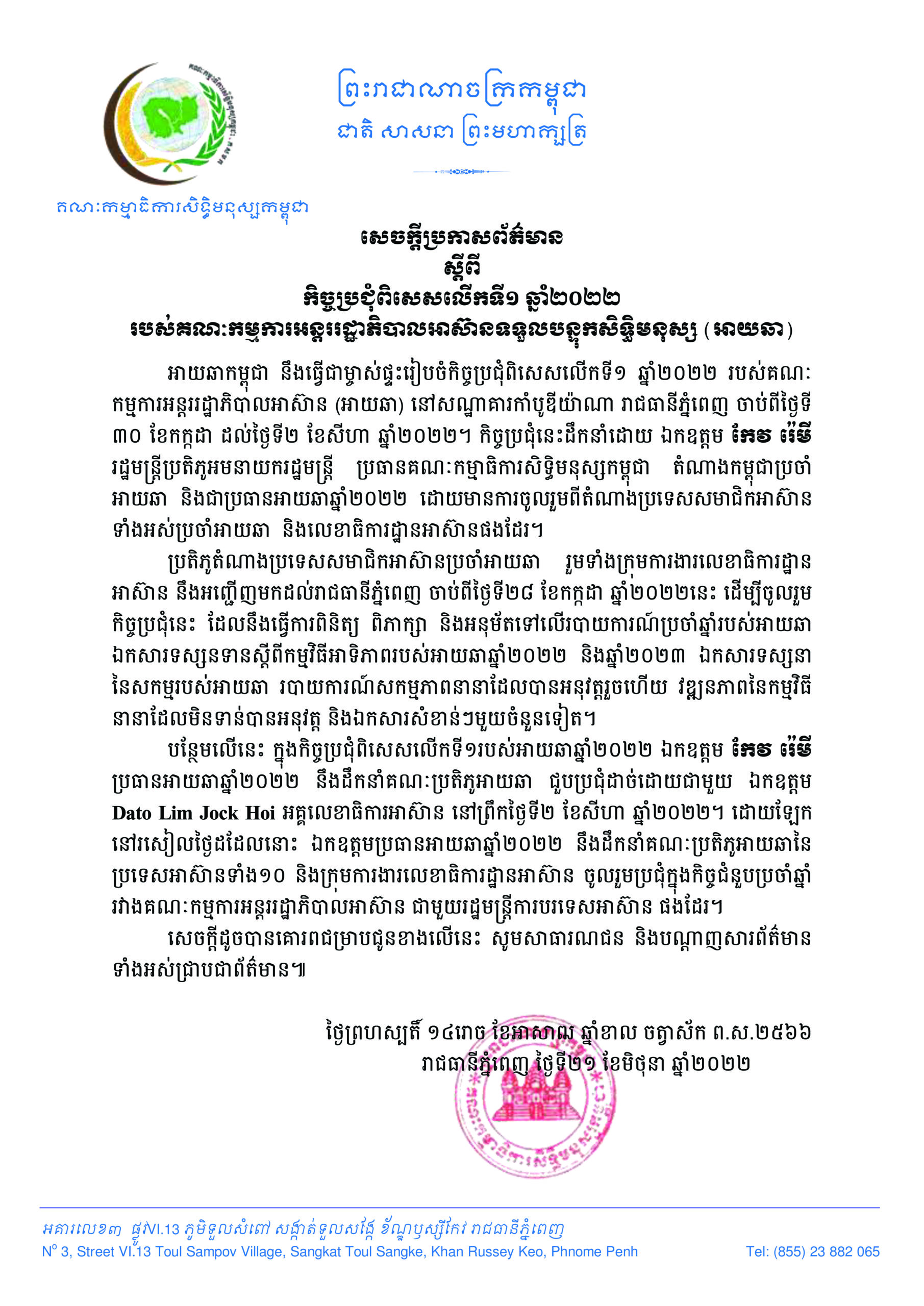 គណៈកម្មាធិការសិទ្ធិមនុស្សកម្ពុជា ក្នុងនាមជាប្រធានគណៈកម្មការអន្តររដ្ឋាភិបាលអាស៊ាន ទទួលបន្ទុកសិទ្ធិមនុស្ស (អាយឆា) ឆ្នាំ២០២២ នឹងរៀបចំកិច្ចប្រជុំលើកទី៣៥ របស់អាយឆា តាម ប្រព័ន្ធវីដេអូ រយៈពេលបីថ្ងៃ ចាប់ពីថ្ង...