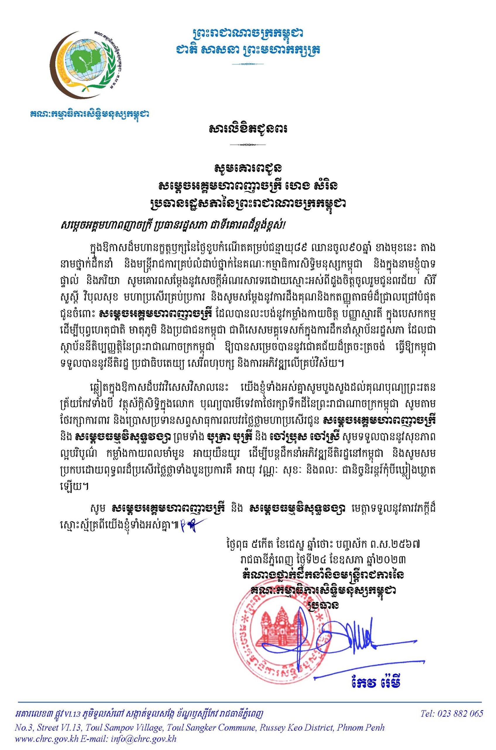 សារលិខិតជូនពរ សូមគោរពជូន សម្ដេចអគ្គមហាពញាចក្រី ហេង សំរិន ប្រធានរដ្ឋសភានៃព្រះរាជាណាចក្រកម្ពុជាក្នុងឱកាសដ៏មហានក្ខត្តឫក្សនៃថ្ងៃខួបកំណើតគម្រប់ជន្មាយុ៨៩ ឈានចូល៩០ឆ្នាំ។