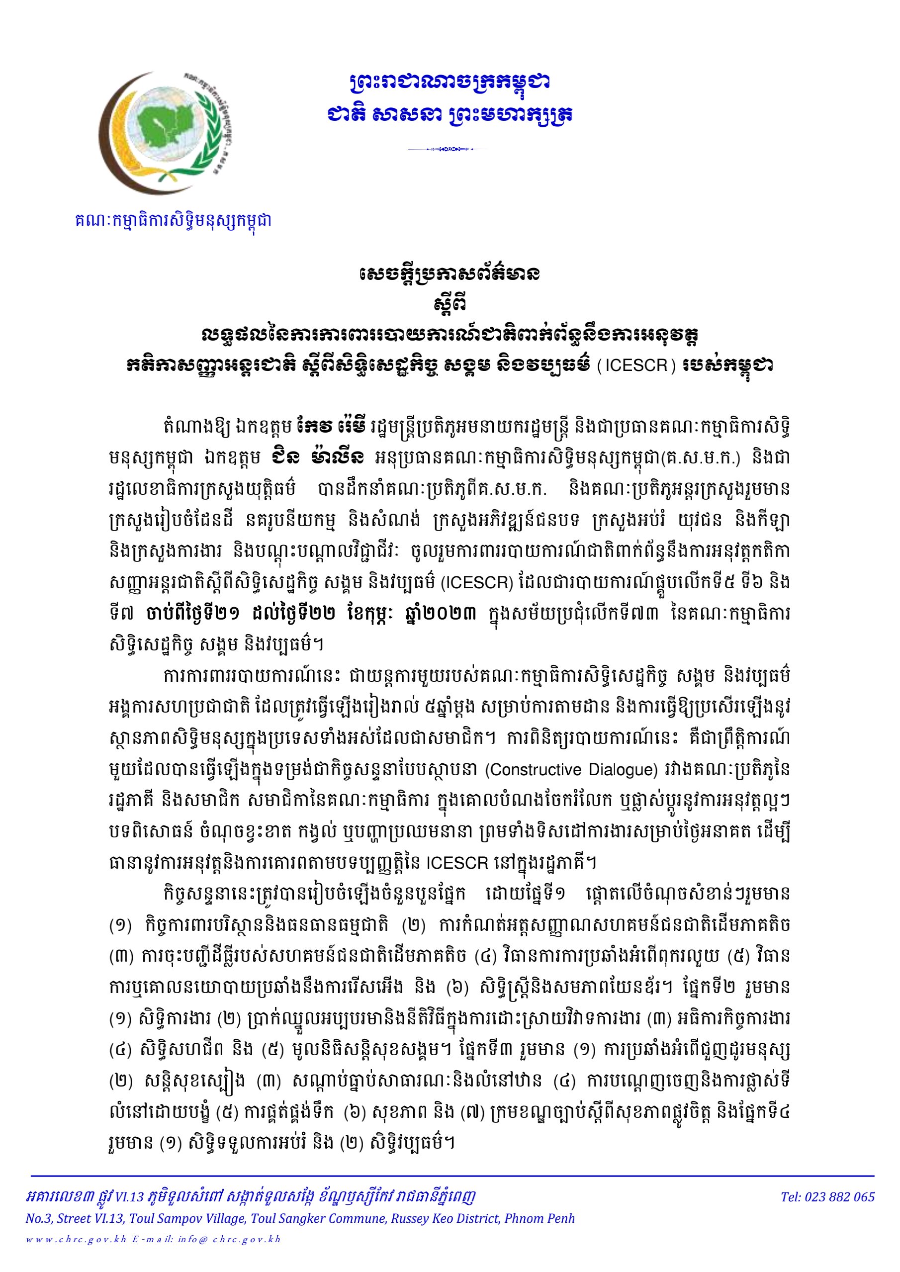 សេចក្តីប្រកាសព័ត៌មាន អំពីលទ្ធផលនៃការចូលរួមការពាររបាយការណ៍ជាតិស្តីពីការអនុវត្តកតិកាសញ្ញាអន្តរជាតិស្តីពីសិទ្ធិសេដ្ឋកិច្ច សង្គម និងវប្បធម៌ ថ្ងៃទី២១-២២ ខែកុម្ភៈ ឆ្នាំ២០២៣ នៅទីក្រុងហ្សឺណែល ប្រទេសស្វីស។