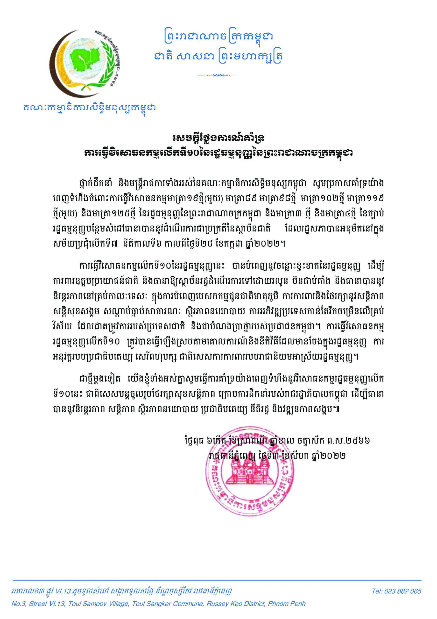 គណៈកម្មាធិការសិទ្ធិមនុស្សកម្ពុជា នៅថ្ងៃទី ០៣ ខែសីហា ឆ្នាំ ២០២២ បានចេញសេចក្តីថ្លែងការណ៍គាំទ្រ ការធ្វើវិសោធនកម្មលើកទី១០នៃរដ្ឋធម្មនុញ្ញនៃព្រះរាជាណាចក្រកម្ពុជា