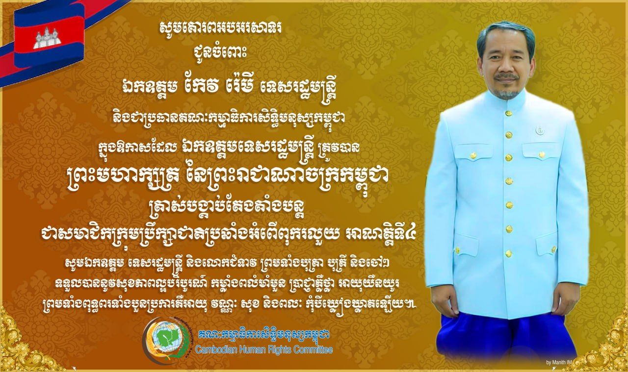 សូមគោរពសាទរ ជូនចំពោះ ឯកឧត្តម កែវ រ៉េមី ទេសរដ្ឋមន្ដ្រី និងជាប្រធានគណៈកម្មាធិការសិទ្ធិមនុស្សកម្ពុជា ត្រូវបានព្រះមហាក្សត្រនៃព្រះរាជាណាចក្រកម្ពុជា តែងតាំងបន្ត ជាសមាជិកក្រុមប្រឹក្សាជាតិប្រឆាំងអំពើពុករលួយ អ...